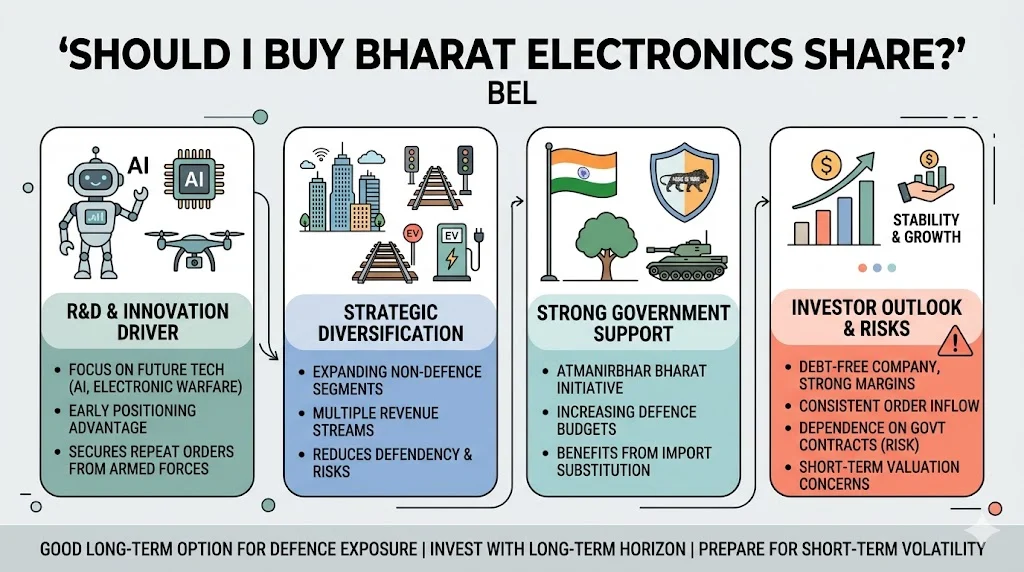 Another important factor is BEL’s diversification into non-defence segments. The company is expanding into areas like smart cities, railway signalling systems, EV charging infrastructure, cybersecurity solutions, and renewable energy. This diversification reduces dependency on defence orders and creates multiple revenue streams. Over time, this can improve stability in earnings and reduce business risk.